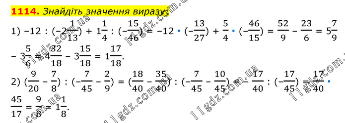 Знайдіть значення виразу: 1) –12 : (–21/13) + 11/4 : (–15/46) = –12 ∙ (–13/27) + 5/4 ∙ (–46/15) = 52/9 – 23/6 = 57/9 – 35/6 = 432/18 – 315/18 = 117/18. 2) (9/20 – 7/8) : (–7/45 – 2/9) = (18/40 – 35/40) : (–7/45 – 10/45) = – 17/40 : (–17/45) = 17/40 ∙ 45/17 = 9/8 = 11/8.