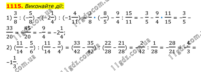 Виконайте дії: 1) 3/8 : (–5/8) – (–21/4) : (–14/11) = 3/8 ∙ (–8/5) – 9/4 : 15/11 = – 3/5 – 9/4 ∙ 11/15 = –3/5 – 33/20 = –45/20 = –9/4 = –21/4; 2) (11/14 – 5/6) : (11/14 – 3/4) = (33/42 – 35/42) : (22/28 – 21/28) = –2/42 : 1/28 = –28/21 = –4/3 = –11/3.