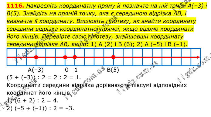 Накресліть координатну пряму й позначте на ній точки А(–3) і В(5). Знайдіть на прямій точку, яка є серединою відрізка AB, і визначте її координату. Висловіть гіпотезу, як знайти координату середини відрізка координатної прямої, якщо відомо координати його кінців. Перевірте свою гіпотезу, знайшовши координату середини відрізка AB, якщо: 1) А (2) і В (6); 2) А (–5) і В (–1). (5 + (–3)) : 2 = 2 : 2 = 1. Координати середини відрізка дорівнюють півсумі відповідних координат його кінців. 1) (6 + 2) : 2 = 4. 2) (–5 + (–1)) : 2 = –3.