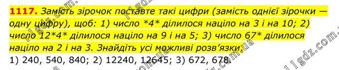 Замість зірочок поставте такі цифри (замість однієї зірочки — одну цифру), щоб: 1) число *4* ділилося націло на 3 і на 10; 2) число 12*4* ділилося націло на 9 і на 5; 3) число 67* ділилося націло на 2 і на 3. Знайдіть усі можливі розв’язки. 1) 240, 540, 840; 2) 12240, 12645; 3) 672, 678.