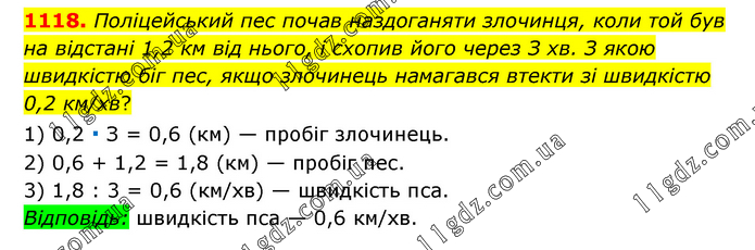 Поліцейський пес почав наздоганяти злочинця, коли той був на відстані 1,2 км від нього, і схопив його через З хв. З якою швидкістю біг пес, якщо злочинець намагався втекти зі швидкістю 0,2 км/хв? 1) 0,2 ∙ З = 0,6 (км) — пробіг злочинець. 2) 0,6 + 1,2 = 1,8 (км) — пробіг пес. 3) 1,8 : 3 = 0,6 (км/хв) — швидкість пса. Відповідь: швидкість пса — 0,6 км/хв.