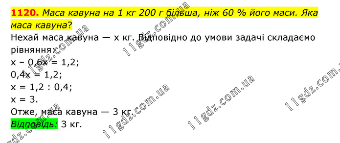 Маса кавуна на 1 кг 200 г більша, ніж 60 % його маси. Яка маса кавуна? Нехай маса кавуна — х кг. Відповідно до умови задачі складаємо рівняння: х – 0,6х = 1,2; 0,4х = 1,2; х = 1,2 : 0,4; х = 3. Отже, маса кавуна — 3 кг. Відповідь: З кг.