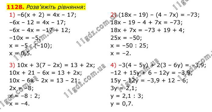 Розв’яжіть рівняння: 1) –6(х + 2) = 4х – 17; –6х – 12 = 4х – 17; –6х – 4х = –17 + 12; –10х = –5; х = –5 : (–10); х = 0,5. 2) (18х – 19) – (4 – 7х) = –73; 18х – 19 – 4 + 7х = –73; 18х + 7х = –73 + 19 + 4; 25х = –50; х = –50 : 25; х = –2. 3) 10х + 3(7 – 2х) = 13 + 2х; 10х + 21 – 6х = 13 + 2х; 10х – 6х – 2х = 13 – 21; 2х = –8; х = –8 : 2; х = –4. 4) –3(4 – 5у) + 2(3 – 6у) = –3,9; –12 + 15у + 6 – 12у = –3,9; 15у – 12у = –3,9 + 12 – 6; 3у = 2,1; у = 2,1 : 3; у = 0,7.