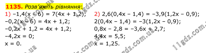 Розв’яжіть рівняння: 1) –1,4(х – 6) = 7(4х + 1,2); –0,2(х – 6) = 4х + 1,2; –0,2х + 1,2 = 4х + 1,2; –4,2х = 0; х = 0. 2) 2,6(0,4х – 1,4) = –3,9(1,2х – 0,9); 2(0,4х – 1,4) = –3(1,2х – 0,9); 0,8х – 2,8 = –3,6х + 2,7; 4,4х = 5,5; х = 1,25.