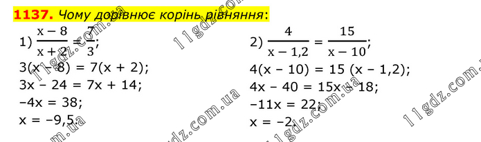 Чому дорівнює корінь рівняння: 1) (х - 8)/(х + 2) = 7/3; 3(х – 8) = 7(х + 2); 3х – 24 = 7х + 14; –4х = 38; х = –9,5. 2) 4/(х - 1,2) = 15/(х - 10); 4(х – 10) = 15 (х – 1,2); 4х – 40 = 15х – 18; –11х = 22; х = –2.