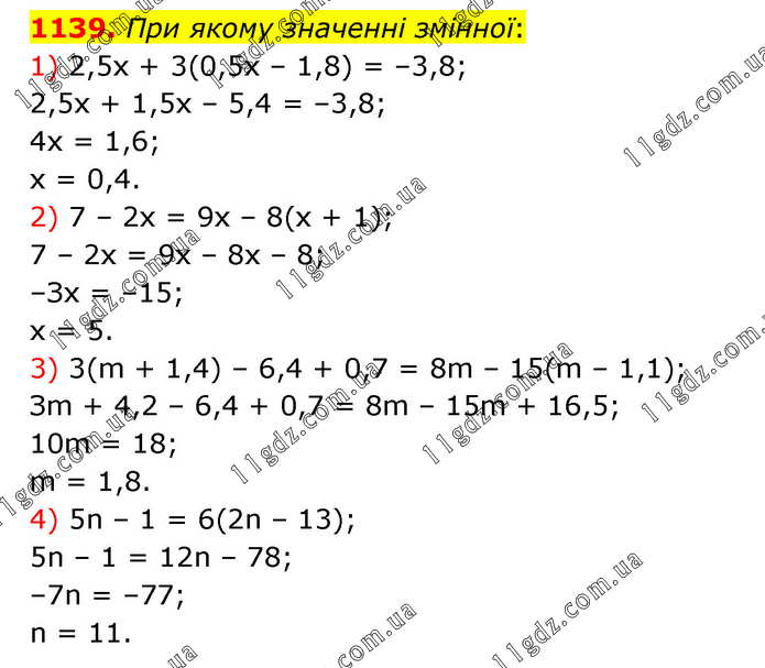 При якому значенні змінної: 1) 2,5х + 3(0,5х – 1,8) = –3,8; 2,5х + 1,5х – 5,4 = –3,8; 4х = 1,6; х = 0,4. 2) 7 – 2х = 9х – 8(х + 1); 7 – 2х = 9х – 8х – 8; –Зх = –15; х = 5. 3) 3(m + 1,4) – 6,4 + 0,7 = 8m – 15(m – 1,1); Зm + 4,2 – 6,4 + 0,7 = 8m – 15m + 16,5; 10m = 18; m = 1,8. 4) 5n – 1 = 6(2n – 13); 5n – 1 = 12n – 78; –7n = –77;