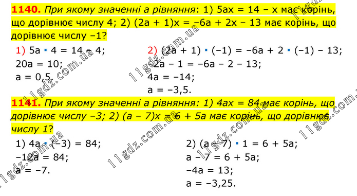 1140. При якому значенні а рівняння: 1) 5ах = 14 – х має корінь, що дорівнює числу 4; 2) (2а + 1)х = –6а + 2х – 13 має корінь, що дорівнює числу –1? 1) 5a ∙ 4 = 14 – 4; 20а = 10; а = 0,5. 2) (2а + 1) ∙ (–1) = –6а + 2 ∙ (–1) – 13; –2а – 1 = –6а – 2 – 13; 4а = –14; а = –3,5. 1141. При якому значенні а рівняння: 1) 4ах = 84 має корінь, що дорівнює числу –3; 2) (а – 7)х = 6 + 5а має корінь, що дорівнює числу 1? 1) 4а ∙ (–3) = 84; –12а = 84; а = –7. 2) (а – 7) ∙ 1 = 6 + 5а; а – 7 = 6 + 5а; –4а = 13; а = –3,25.
