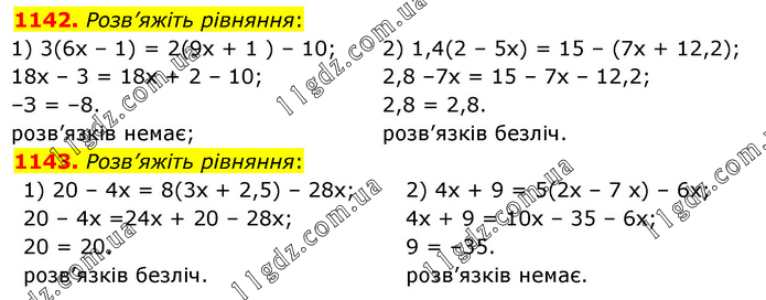 1142. Розв’яжіть рівняння: 1) 3(6х – 1) = 2(9х + 1 ) – 10; 18х – 3 = 18х + 2 – 10; –З = –8. розв’язків немає; 2) 1,4(2 – 5х) = 15 – (7х + 12,2); 2,8 –7х = 15 – 7х – 12,2; 2,8 = 2,8. розв’язків безліч. 1143. Розв’яжіть рівняння: 1) 20 – 4х = 8(3х + 2,5) – 28х; 20 – 4х =24х + 20 – 28х; 20 = 20. розв’язків безліч. 2) 4х + 9 = 5(2х – 7 х) – 6х; 4х + 9 = 10х – 35 – 6х; 9 = –35. розв’язків немає.