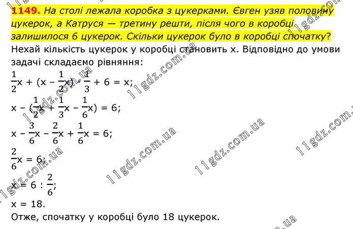 На столі лежала коробка з цукерками. Євген узяв половину цукерок, а Катруся — третину решти, після чого в коробці залишилося 6 цукерок. Скільки цукерок було в коробці спочатку? Нехай кількість цукерок у коробці становить х. Відповідно до умови задачі складаємо рівняння: 1/2х + (х – 1/2х) ∙ 1/3 + 6 = х; х – (1/2х + 1/3х – 1/6х) = 6; х – 3/6х – 2/6х + 1/6х = 6; 2/6х = 6; х = 6 : 2/6; х = 18. Отже, спочатку у коробці було 18 цукерок.