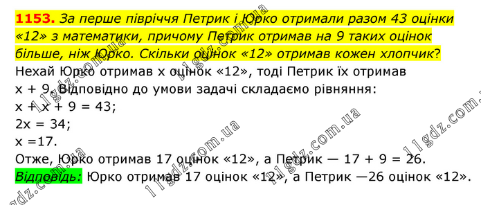 За перше півріччя Петрик і Юрко отримали разом 43 оцінки «12» з математики, причому Петрик отримав на 9 таких оцінок більше, ніж Юрко. Скільки оцінок «12» отримав кожен хлопчик? Нехай Юрко отримав х оцінок «12», тоді Петрик їх отримав х + 9. Відповідно до умови задачі складаємо рівняння: х + х + 9 = 43; 2х = 34; х =17. Отже, Юрко отримав 17 оцінок «12», а Петрик — 17 + 9 = 26. Відповідь: Юрко отримав 17 оцінок «12», а Петрик —26 оцінок «12».