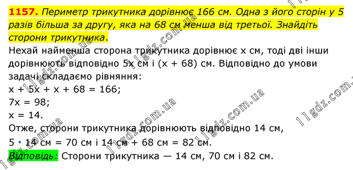 Периметр трикутника дорівнює 166 см. Одна з його сторін у 5 разів більша за другу, яка на 68 см менша від третьої. Знайдіть сторони трикутника. Нехай найменша сторона трикутника дорівнює х см, тоді дві інши дорівнюють відповідно 5х см і (х + 68) см. Відповідно до умови задачі складаємо рівняння: х + 5х + х + 68 = 166; 7х = 98; х = 14. Отже, сторони трикутника дорівнюють відповідно 14 см, 5 ∙ 14 см = 70 см і 14 см + 68 см = 82 см. Відповідь: Сторони трикутника — 14 см, 70 см і 82 см.