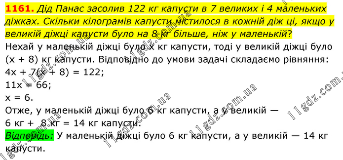 Дід Панас засолив 122 кг капусти в 7 великих і 4 маленьких діжках. Скільки кілограмів капусти містилося в кожній діж ці, якщо у великій діжці капусти було на 8 кг більше, ніж у маленькій? Нехай у маленькій діжці було х кг капусти, тоді у великій діжці було (х + 8) кг капусти. Відповідно до умови задачі складаємо рівняння: 4х + 7(х + 8) = 122; 11x = 66; х = 6. Отже, у маленькій діжці було 6 кг капусти, а у великій — 6 кг + 8 кг = 14 кг капусти. Відповідь: У маленькій діжці було 6 кг капусти, а у великій — 14 кг капусти.
