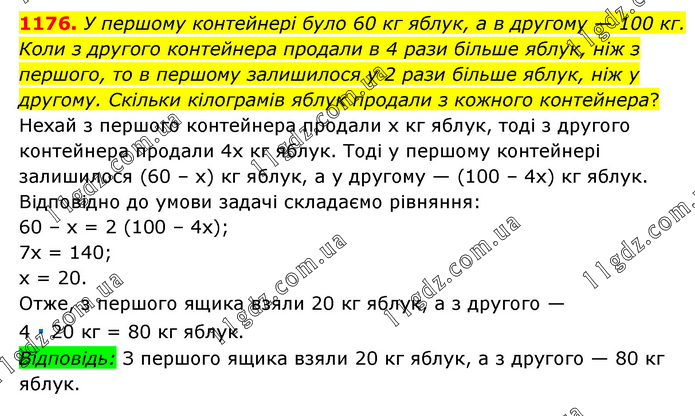 У першому контейнері було 60 кг яблук, а в другому — 100 кг. Коли з другого контейнера продали в 4 рази більше яблук, ніж з першого, то в першому залишилося у 2 рази більше яблук, ніж у другому. Скільки кілограмів яблук продали з кожного контейнера? Нехай з першого контейнера продали х кг яблук, тоді з другого контейнера продали 4х кг яблук. Тоді у першому контейнері залишилося (60 – х) кг яблук, а у другому — (100 – 4х) кг яблук. Відповідно до умови задачі складаємо рівняння: 60 – х = 2 (100 – 4х); 7х = 140; х = 20. Отже, з першого ящика взяли 20 кг яблук, а з другого — 4 ∙ 20 кг = 80 кг яблук. Відповідь: З першого ящика взяли 20 кг яблук, а з другого — 80 кг яблук.