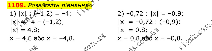 Розв’яжіть рівняння: 1) |х| : (–1,2) = –4; |х| = –4 – (–1,2); |х| = 4,8; х = 4,8 або х = –4,8. 2) –0,72 : |х| = –0,9; |х| = –0,72 : (–0,9); |х| = 0,8; х = 0,8 або х = –0,8.