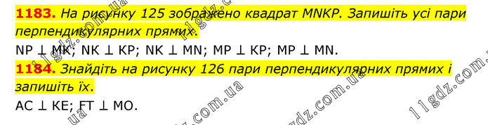1183. На рисунку 125 зображено квадрат MNKP. Запишіть усі пари перпендикулярних прямих. NР ⊥ МК; NК ⊥ КР; NK ⊥ МN; МР ⊥ КР; МР ⊥ МN. 1184. Знайдіть на рисунку 126 пари перпендикулярних прямих і запишіть їх. АС ⊥ КЕ; FТ ⊥ МО.
