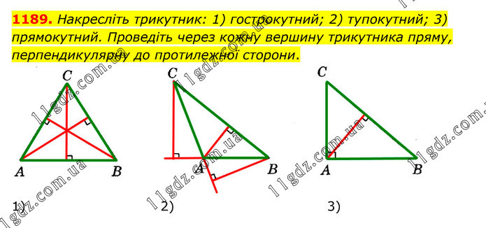 Накресліть трикутник: 1) гострокутний; 2) тупокутний; 3) прямокутний. Проведіть через кожну вершину трикутника пряму, перпендикулярну до протилежної сторони.