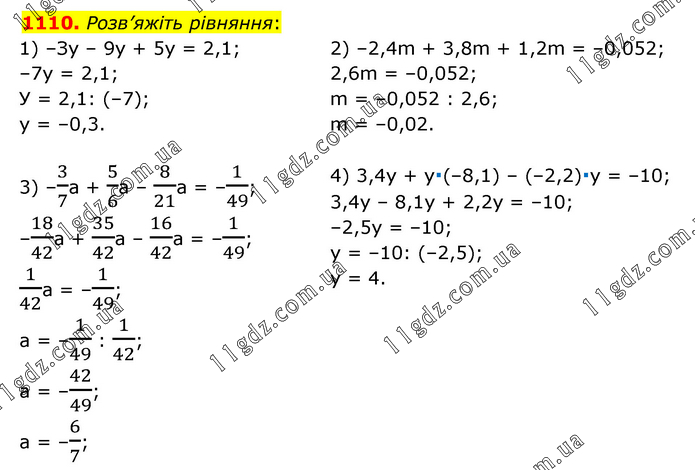 Розв’яжіть рівняння: 1) –Зу – 9у + 5у = 2,1; –7у = 2,1; У = 2,1: (–7); у = –0,3. 2) –2,4m + 3,8m + 1,2m = –0,052; 2,6m = –0,052; m = –0,052 : 2,6; m = –0,02. 3) –3/7а + 5/6а – 8/21а = –1/49; –18/42а + 35/42а – 16/42а = –1/49; 1/42а = –1/49; а = –1/49 : 1/42; а = –42/49; а = –6/7; 4) 3,4у + у∙(–8,1) – (–2,2)∙у = –10; 3,4у – 8,1у + 2,2у = –10; –2,5у = –10; у = –10: (–2,5); у = 4.