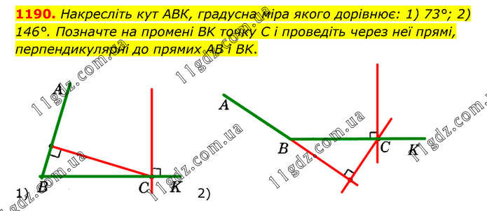 Накресліть кут АВК, градусна міра якого дорівнює: 1) 73°; 2) 146°. Позначте на промені BK точку C і проведіть через неї прямі, перпендикулярні до прямих AB і BK.