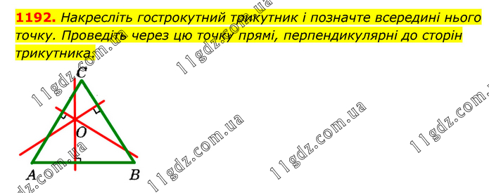 Накресліть гострокутний трикутник і позначте всередині нього точку. Проведіть через цю точку прямі, перпендикулярні до сторін трикутника.