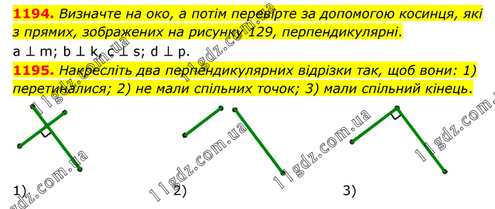 1194. Визначте на око, а потім перевірте за допомогою косинця, які з прямих, зображених на рисунку 129, перпендикулярні. a ⊥ m; b ⊥ k, с ⊥ s; d ⊥ р. 1195. Накресліть два перпендикулярних відрізки так, щоб вони: 1) перетиналися; 2) не мали спільних точок; 3) мали спільний кінець.