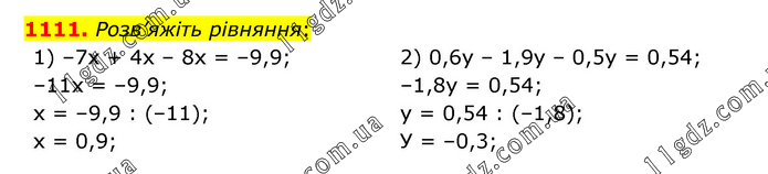 Розв’яжіть рівняння: 1) –7х + 4х – 8х = –9,9; –11х = –9,9; х = –9,9 : (–11); х = 0,9; 2) 0,6у – 1,9у – 0,5у = 0,54; –1,8у = 0,54; у = 0,54 : (–1,8); У = –0,3;
