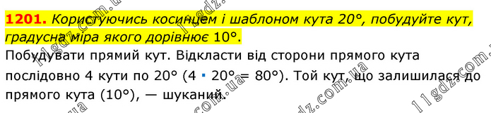 Користуючись косинцем і шаблоном кута 20°, побудуйте кут, градусна міра якого дорівнює 10°. Побудувати прямий кут. Відкласти від сторони прямого кута послідовно 4 кути по 20° (4 ∙ 20° = 80°). Той кут, що залишилася до прямого кута (10°), — шуканий.