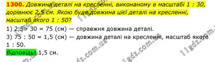Довжина деталі на кресленні, виконаному в масштабі 1 : 30, дорівнює 2,5 см. Якою буде довжина цієї деталі на кресленні, масштаб якого 1 : 50? 1) 2,5 ∙ 30 = 75 (см) — справжня довжина деталі. 3) 75 : 50 = 1,5 (см) — довжина деталі на кресленні, масштаб якого 1 : 50. Відповідь: 1,5 см.