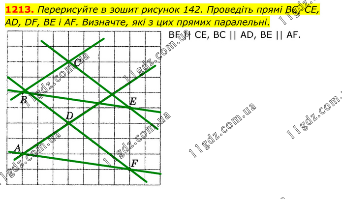 Перерисуйте в зошит рисунок 142. Проведіть прямі BC, CE, AD, DF, BE і AF. Визначте, які з цих прямих паралельні. BF || CE, BC || AD, BE || AF.