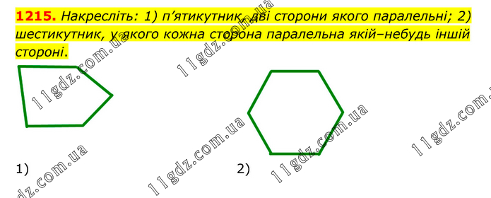 Накресліть: 1) п’ятикутник, дві сторони якого паралельні; 2) шестикутник, у якого кожна сторона паралельна якій–небудь іншій стороні.