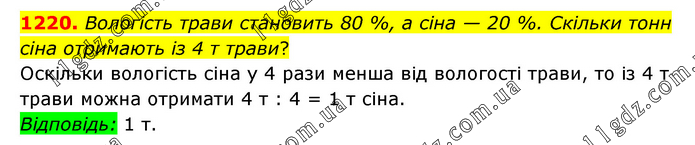 Вологість трави становить 80 %, а сіна — 20 %. Скільки тонн сіна отримають із 4 т трави? Оскільки вологість сіна у 4 рази менша від вологості трави, то із 4 т трави можна отримати 4 т : 4 = 1 т сіна. Відповідь: 1 т.