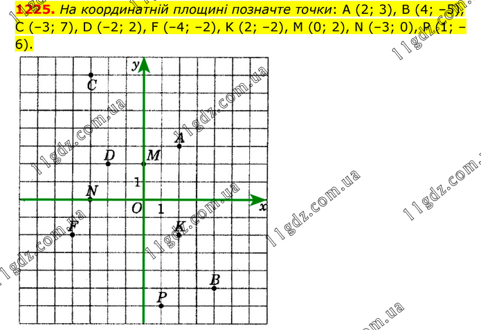 На координатній площині позначте точки: А (2; 3), В (4; –5), C (–3; 7), D (–2; 2), F (–4; –2), K (2; –2), M (0; 2), N (–3; 0), P (1; –6).