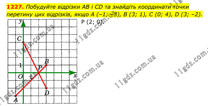 Побудуйте відрізки AB і CD та знайдіть координати точки перетину цих відрізків, якщо А (–1; –3), В (3; 1), C (0; 4), D (3; –2). Р (2; 0).