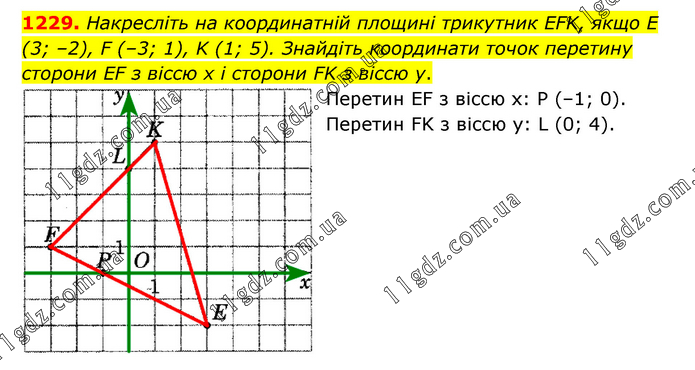 Накресліть на координатній площині трикутник EFK, якщо E (3; –2), F (–3; 1), K (1; 5). Знайдіть координати точок перетину сторони EF з віссю х і сторони FK з віссю у. Перетин EF з віссю х: Р (–1; 0). Перетин FK з віссю у: L (0; 4).