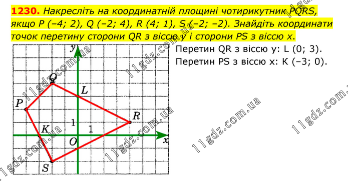 Накресліть на координатній площині чотирикутник PQRS, якщо P (–4; 2), Q (–2; 4), R (4; 1), S (–2; –2). Знайдіть координати точок перетину сторони QR з віссю у і сторони PS з віссю х. Перетин QR з віссю у: L (0; 3). Перетин РS з віссю х: К (–3; 0).