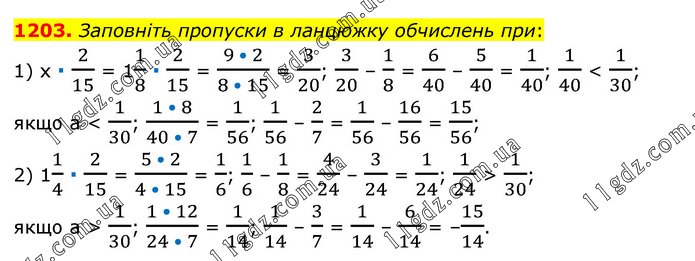 Заповніть пропуски в ланцюжку обчислень при: 1) х ∙ 2/15 = 11/8 ∙ 2/15 = (9 • 2)/(8 • 15) = 3/20; 3/20 – 1/8 = 6/40 – 5/40 = 1/40; 1/40 < 1/30; якщо а < 1/30; (1 • 8)/(40 • 7) = 1/56; 1/56 – 2/7 = 1/56 – 16/56 = 15/56; 2) 11/4 ∙ 2/15 = (5 • 2)/(4 • 15) = 1/6; 1/6 – 1/8 = 4/24 – 3/24 = 1/24; 1/24 > 1/30; якщо а > 1/30; (1 • 12)/(24 • 7) = 1/14; 1/14 – 3/7 = 1/14 – 6/14 = –15/14.