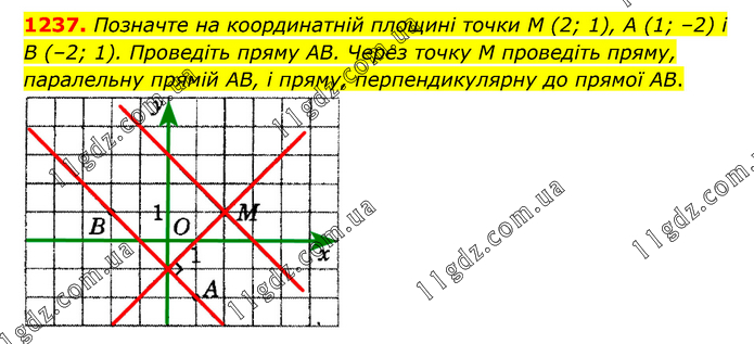 Позначте на координатній площині точки M (2; 1), А (1; –2) і В (–2; 1). Проведіть пряму AB. Через точку M проведіть пряму, паралельну прямій AB, і пряму, перпендикулярну до прямої AB.