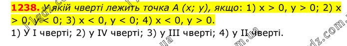 У якій чверті лежить точка А (х; у), якщо: 1) х > 0, у > 0; 2) х > 0, у < 0; 3) х < 0, у < 0; 4) х < 0, у > 0. 1) У І чверті; 2) у IV чверті; 3) у III чверті; 4) у II чверті.