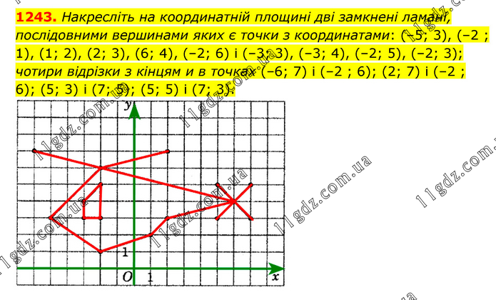 Накресліть на координатній площині дві замкнені ламані, послідовними вершинами яких є точки з координатами: (–5; 3), (–2 ; 1), (1; 2), (2; 3), (6; 4), (–2; 6) і (–3; 3), (–3; 4), (–2; 5), (–2; 3); чотири відрізки з кінцям и в точках (–6; 7) і (–2 ; 6); (2; 7) і (–2 ; 6); (5; 3) і (7; 5); (5; 5) і (7; 3).