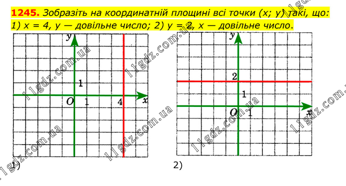 Зобразіть на координатній площині всі точки (х; у) такі, що: 1) х = 4, у — довільне число; 2) у = 2, х — довільне число.