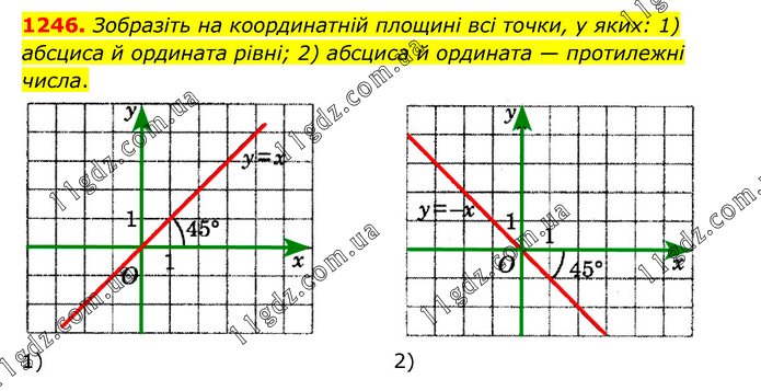 Зобразіть на координатній площині всі точки, у яких: 1) абсциса й ордината рівні; 2) абсциса й ордината — протилежні числа.