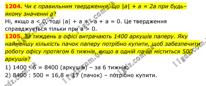 1204. Чи є правильним твердження, що |а| + а = 2а при будь–якому значенні а? Ні, якщо а < 0, тоді |а| + а = –а + а = 0. Це твердження справджується тільки при а > 0. 1205. За тиждень в офісі витрачають 1400 аркушів паперу. Яку найменшу кількість пачок паперу потрібно купити, щоб забезпечити роботу офісу протягом 6 тижнів, якщо в одній пачці міститься 500 аркушів? 1) 1400 ∙ 6 = 8400 (аркушів) – за 6 тижнів; 2) 8400 : 500 = 16,8 = 17 (пачок) – потрібно купити.