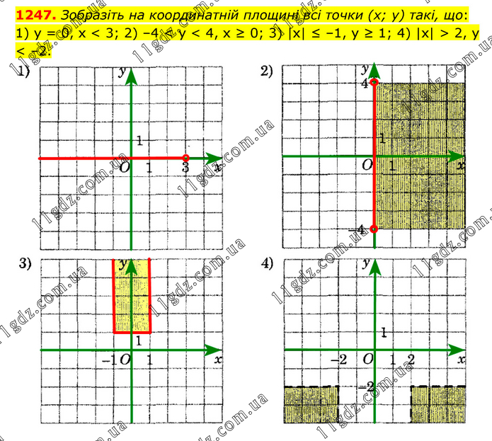 Зобразіть на координатній площині всі точки (х; у) такі, що: 1) у = 0, х < 3; 2) –4 < y < 4, x ≥ 0; 3) |х| ≤ –1, у ≥ 1; 4) |x| > 2, y < –2.