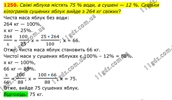 Свіжі яблука містять 75 % води, а сушені — 12 %. Скільки кілограмів сушених яблук вийде з 264 кг свіжих? Чиста маса яблук без води: 264 кг — 100%, х кг — 25%. 264/х = 100/25; х = (25 • 264)/100; х = 66. Отже, чиста маса яблук становить 66 кг. Чистої маси у сушених яблуках є 100% – 12% = 88%. х кг — 100%, 66 кг — 88%. х/66 = 100/88; х = (100 • 66)/88; х = 75. Отже, вийде 75 сушених яблук. Відповідь: 75 кг.