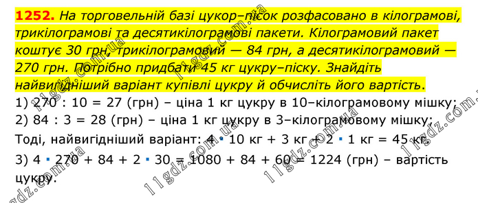 На торговельній базі цукор–пісок розфасовано в кілограмові, трикілограмові та десятикілограмові пакети. Кілограмовий пакет коштує 30 грн, трикілограмовий — 84 грн, а десятикілограмовий — 270 грн. Потрібно придбати 45 кг цукру–піску. Знайдіть найвигідніший варіант купівлі цукру й обчисліть його вартість. 1) 270 : 10 = 27 (грн) – ціна 1 кг цукру в 10–кілограмовому мішку; 2) 84 : 3 = 28 (грн) – ціна 1 кг цукру в 3–кілограмовому мішку; Тоді, найвигідніший варіант: 4 ∙ 10 кг + 3 кг + 2 ∙ 1 кг = 45 кг. 3) 4 ∙ 270 + 84 + 2 ∙ 30 = 1080 + 84 + 60 = 1224 (грн) – вартість цукру.