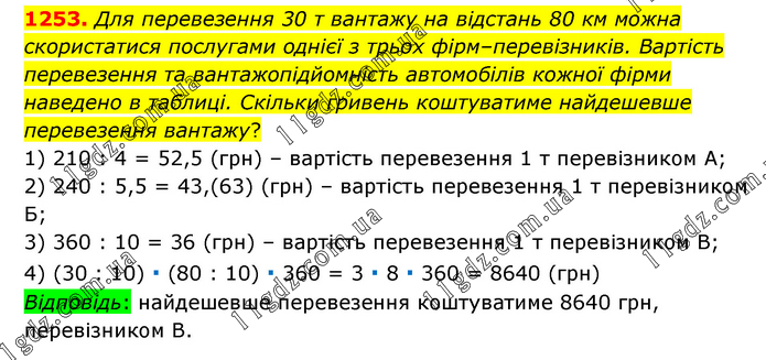 Для перевезення 30 т вантажу на відстань 80 км можна скористатися послугами однієї з трьох фірм–перевізників. Вартість перевезення та вантажопідйомність автомобілів кожної фірми наведено в таблиці. Скільки гривень коштуватиме найдешевше перевезення вантажу? 1) 210 : 4 = 52,5 (грн) – вартість перевезення 1 т перевізником А; 2) 240 : 5,5 = 43,(63) (грн) – вартість перевезення 1 т перевізником Б; 3) 360 : 10 = 36 (грн) – вартість перевезення 1 т перевізником В; 4) (30 : 10) ∙ (80 : 10) ∙ 360 = 3 ∙ 8 ∙ 360 = 8640 (грн) Відповідь: найдешевше перевезення коштуватиме 8640 грн, перевізником В.