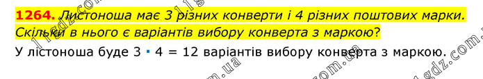 Листоноша має 3 різних конверти і 4 різних поштових марки. Скільки в нього є варіантів вибору конверта з маркою? У лістоноша буде 3 ∙ 4 = 12 варіантів вибору конверта з маркою.