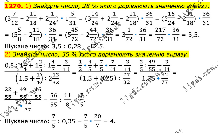 1) Знайдіть число, 28 % якого дорівнюють значенню виразу. (37/12 – 211/18 + 21/24) ∙ 15/31 = (314/24 + 21/24 – 211/18) ∙ 36/31 = (515/24 – 211/18) ∙ 36/31 = (55/8 – 211/18) ∙ 36/31 = (545/72 – 244/72) ∙ 36/31 = 31/72 ∙ 36/31 = 217/72 ∙ 36/31 = 3,5. Шукане число: 3,5 : 0,28 = 12,5. 2) Знайдіть число, 35 % якого дорівнюють значенню виразу. (0,5 ∶ 1 1/4 + 1 2/5 ∶ 1 4/7 - 3/11)/((1,5 + 1/4) ∶ 2 13/32) = (1/2 • 4/5 + 7/5 • 7/11 - 3/11)/((1,5 + 0,25) ∶ 77/32) = (2/5 ∶ 49/55 - 3/11)/(1,75 • 32/77) = (22/55 + 49/55 - 15/55)/(7/4 • 32/77) = 56/55 : 11/8 = 7/5. Шукане число: 7/5 : 0,35 = 7/5 ∙ 20/7 = 4.
