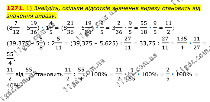 1) Знайдіть, скільки відсотків значення виразу становить від значення виразу. (87/12 – 519/36) ∙ 14/5 = (821/36 – 519/36) ∙ 9/5 = 32/36 ∙ 9/5 = 55/18 ∙ 9/5 = 11/2; (39,375 – 55/8) : 25/11 = (39,375 – 5,625) : 27/11 = 33,75 : 27/11 = 135/4 ∙ 11/27 = 55/4. 11/2 від 55/4 становить 11/2 : 55/4 ∙ 100% = 11/2 ∙ 4/55 ∙ 100% = 2/5 ∙ 100% = 40%.