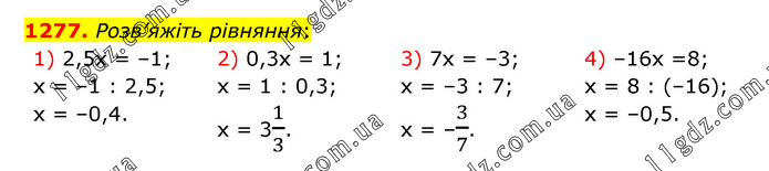 Розв’яжіть рівняння: 1) 2,5х = –1; х = –1 : 2,5; х = –0,4. 2) 0,3х = 1; х = 1 : 0,3; х = 31/3. 3) 7х = –3; х = –3 : 7; х = –3/7. 4) –16х =8; х = 8 : (–16); х = –0,5.
