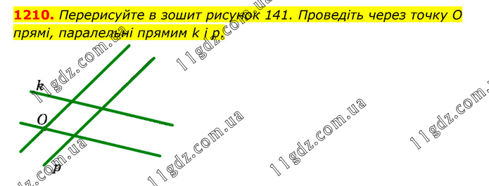 Перерисуйте в зошит рисунок 141. Проведіть через точку O прямі, паралельні прямим k i p.